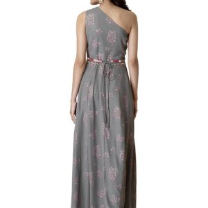 Indya Women’s Grey Kurta Foil One Shoulder Belted Maxi