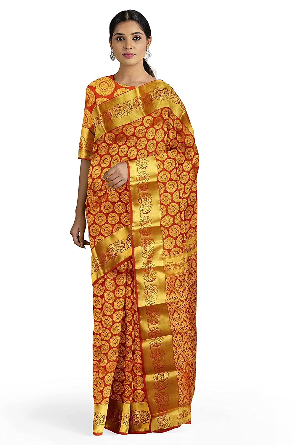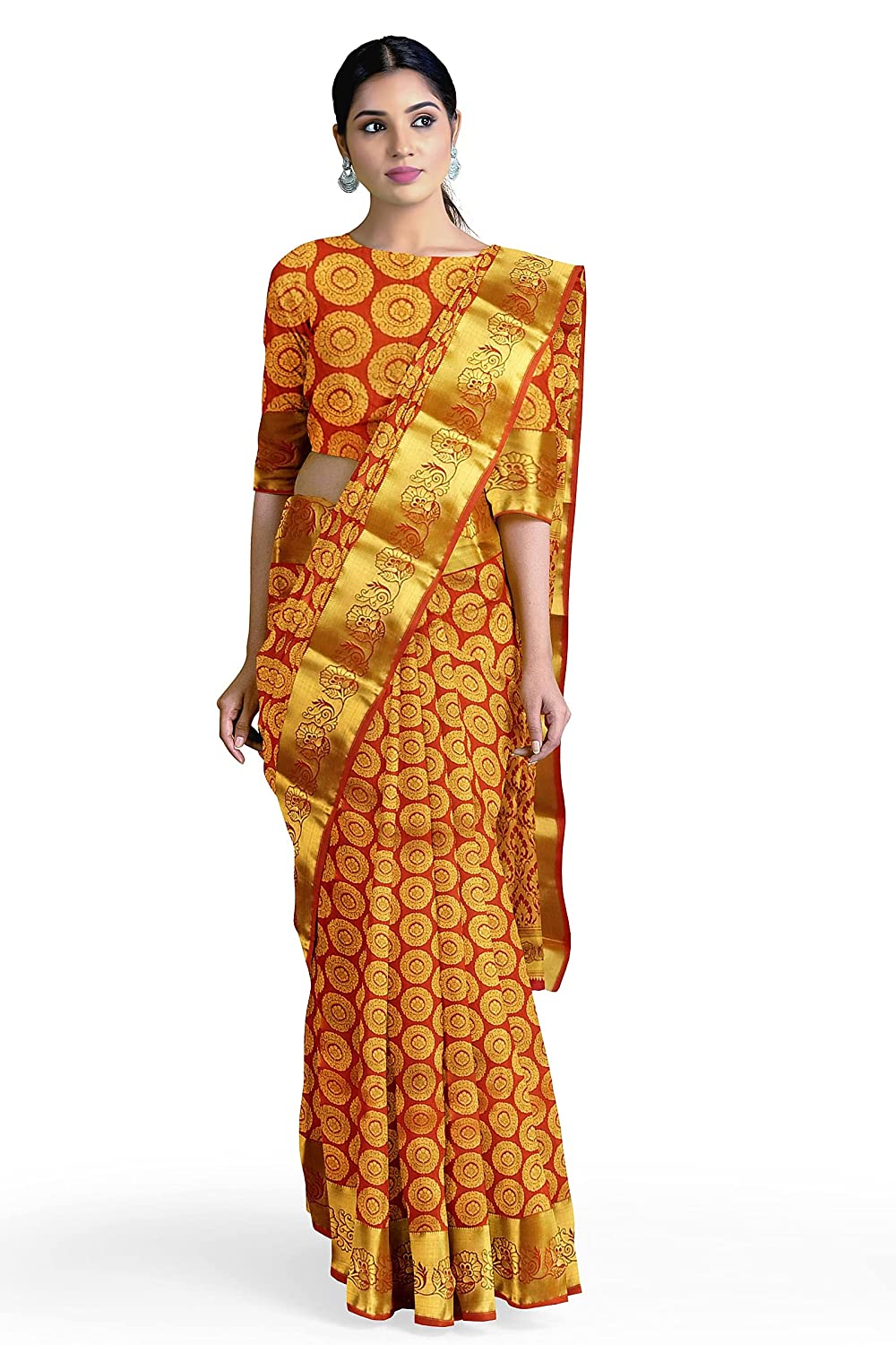 This is elegantly designer Designer kanjivaram saree with circle self design motifs all over the saree with zari weaving border.This saree has Golden zari work pallu with zari kanjivaram style weaving . please zoom in the pics to see the karigari of our weavers. this is authentic kanjivaram silk saree. Please note – this is NOT a pure silk saree product. Saree Length-6.3 mtr ,Blouse length 5.50+0.80 mtr.,fabric- Kanjivaram silk,(blouse attach at the end of saree) You can visit our store at AMAZON for different type of variety of sarees like Kanjivaram, Banarasi, Chikankari etc .minor colour variation possible due to photographic light effect or your monitor settings.