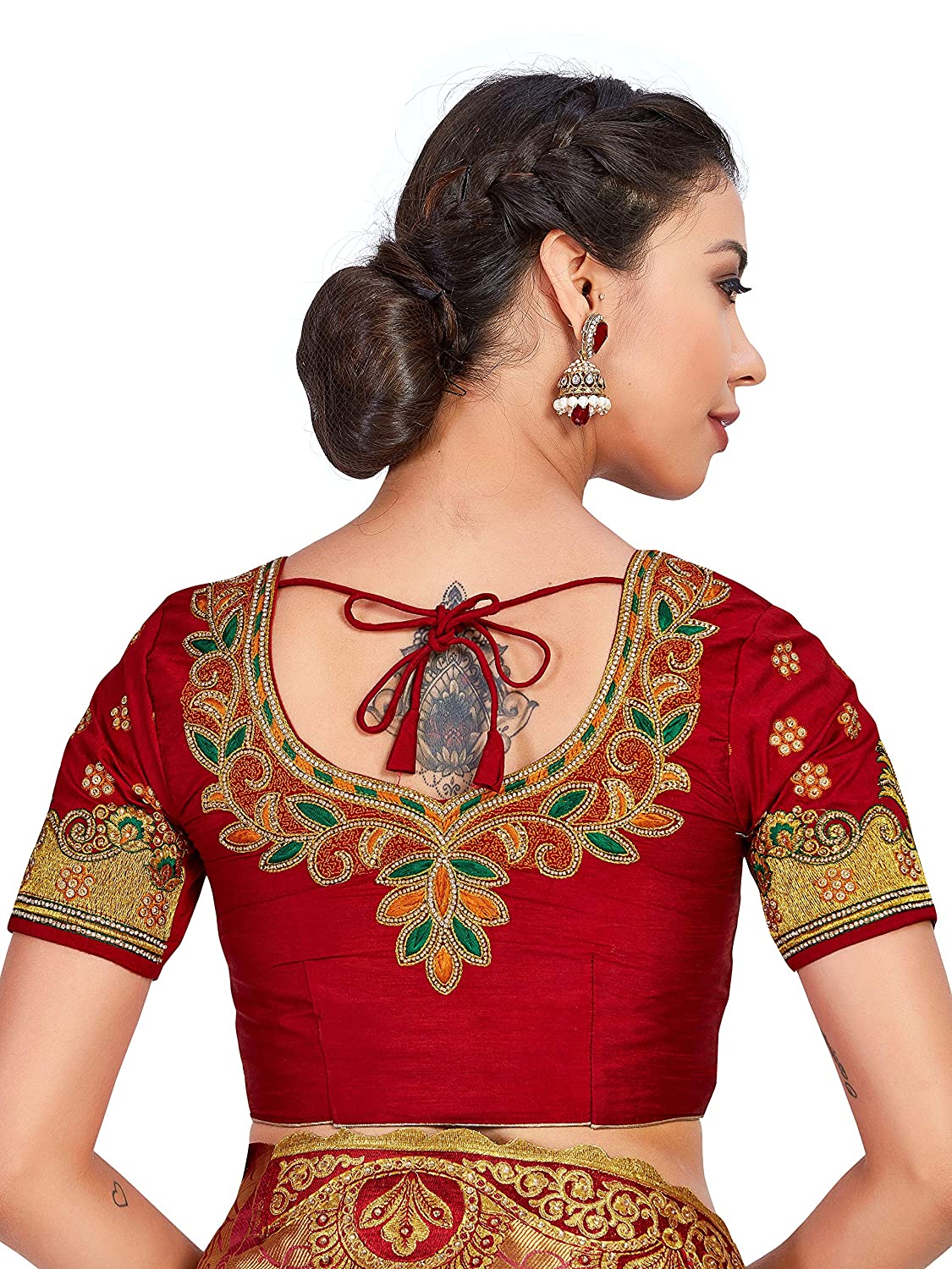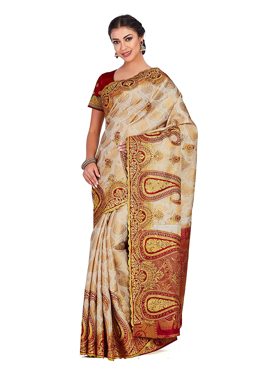 Colour: Beige II Fabric: Art Silk II Length: 6.2 Mtr Including Blouse / Size: Free Size II Blouse Colour: Maroon II Blouse Type: Contrast Unstiched Embrodered Blouse